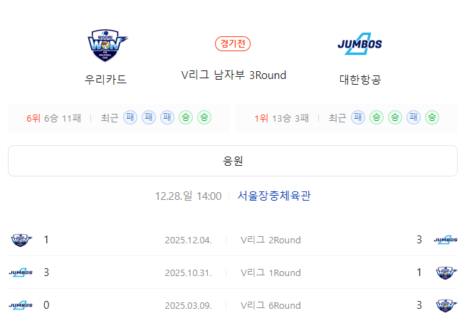우리카드 대한항공 상대 최근 홈 12경기
