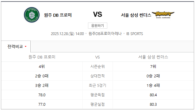 - 평균 득점: 원주 DB 82.34점, 서울 삼성 77.41점