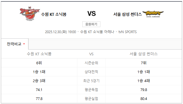 수원 KT vs 서울 삼성 통계
