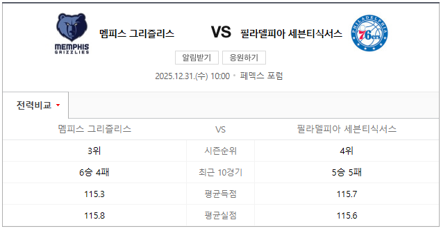 - 필라델피아 최근 멤피스 원정 17경기 연속 1쿼터 31.5점 미만 득점