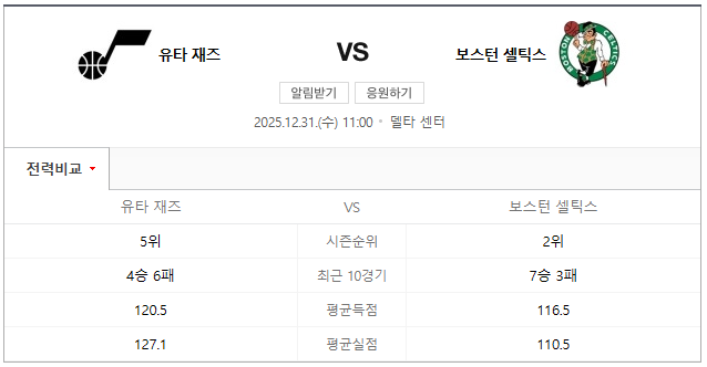 - 유타 최근 보스턴전 8경기 연속 전반 패배