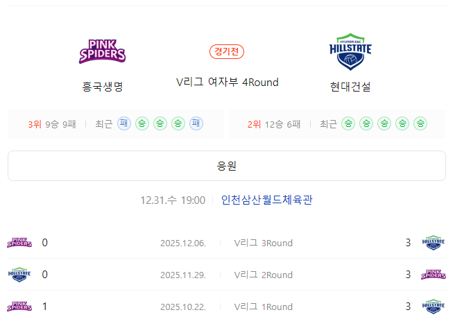 이전 맞대결은 2025년 12월 06일 V리그 여자부에서 진행되었으며, 최종 스코어는 0:3이었다.