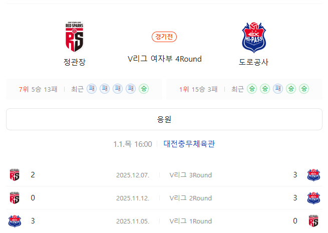 이전 맞대결은 2025년 12월 7일 V리그 여자부에서 진행되었고, 최종 스코어는 2:3이었다.