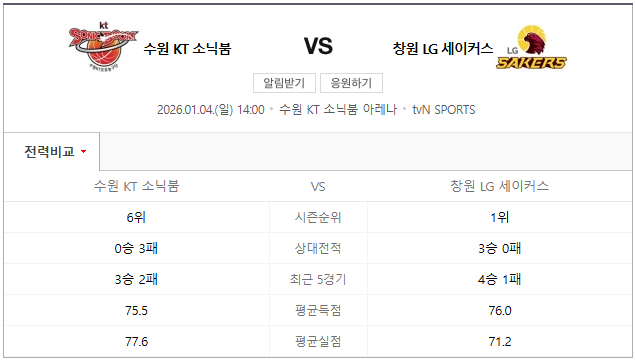 | 고양 소노 vs 수원 KT | KBL (01/03) (0) | 2026.01.03 |