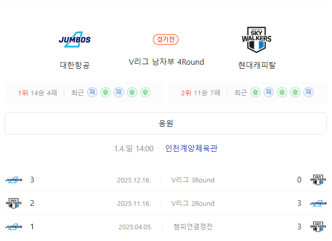 직전 맞대결은 2025년 12월 16일 V리그에서 열렸으며, 최종 스코어는 3:0이었습니다.