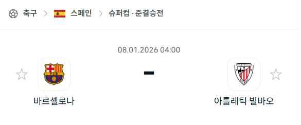 2026년 01월 08일에 열리는 스페인 슈퍼컵 준결승전인 바르셀로나와 아틀레틱 빌바오의 경기 분석입니다. 이번 경기는 스페인에서 가장 권위 있는 트로피 중 하나를 두고 결승 진출을 다투는 중요한 일전입니다. 바르셀로나는 최근 모든 대회에서 8연승을 달리며 파죽지세의 흐름을 보이고 있는 반면, 아틀레틱 빌바오는 최근 승리를 거두는 데 어려움을 겪으며 부진한 모습을 보이고 있습니다. 두 팀의 맞대결 역사를 살펴보면 바르셀로나가 최근 4번의 맞대결에서 모두 승리했으며, 합산 스코어 11-1로 압도적인 우위를 점하고 있습니다. 베팅 업체들 역시 바르셀로나를 이번 경기의 강력한 우승 후보로 꼽고 있습니다. 한지 플릭 감독이 이끄는 바르셀로나의 상승세와 에르네스토 발베르데 감독이 이끄는 아틀레틱 빌바오의 반등 여부가 이번 경기의 관전 포인트가 될 것입니다.