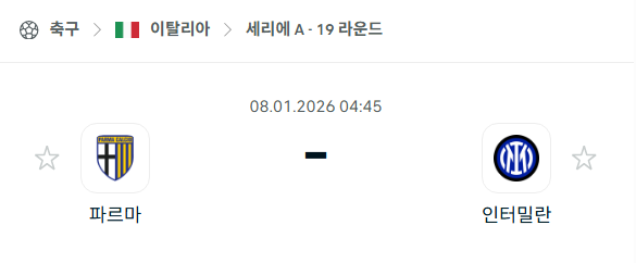 2026년 01월 08일에 열리는 세리에 A의 파르마와 인터 밀란의 경기 분석입니다. 이번 경기는 파르마의 홈구장인 스타디오 엔니오 타르디니에서 펼쳐지는 세리에 A 19라운드 일정입니다. 현재 인터 밀란은 리그 선두 자리를 굳건히 지키며 유력한 우승 후보로서의 입지를 다지고 있습니다. 인터 밀란은 연승 행진을 이어가며 강력한 전력을 과시하고 있습니다. 반면 홈팀 파르마는 최근 4경기에서 단 1패만을 허용하는 등 상당히 경쟁력 있는 모습을 보여주고 있습니다. 최근 흐름이 좋은 파르마는 홈에서 쉽게 물러서지 않겠다는 의지를 보이고 있습니다. 두 팀의 맞대결 기록을 살펴보면 최근 31번의 경기에서 인터 밀란이 16승을 거두며 파르마(6승)를 상대로 압도적인 우위를 점하고 있습니다. 지난 시즌 맞대결에서는 파르마가 홈에서 1-3으로 패배했지만, 원정에서는 2-2 무승부를 거두며 저력을 보여주기도 했습니다. 이번 경기는 선두 수성을 노리는 인터 밀란과 중위권 도약을 꿈꾸는 파르마의 치열한 승부가 예상됩니다.
