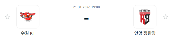 - 저득점 양상(언더): 리그 최상위권의 수비력을 보유한 안양 정관장 레드부스터스이 수원 KT 소닉붐의 화력을 억제하며 전체적인 득점은 낮게 형성될 가능성이 큽니다.