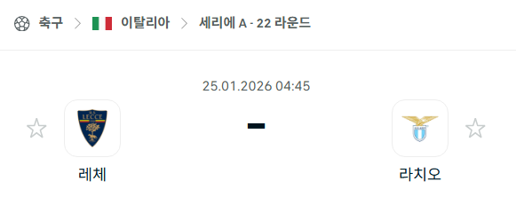 - 라치오 승 (레체의 최근 경기력이 매우 저조하고 라치오가 원정에서 무패 행진을 달리고 있어 원정팀의 우세가 예상됩니다.)
