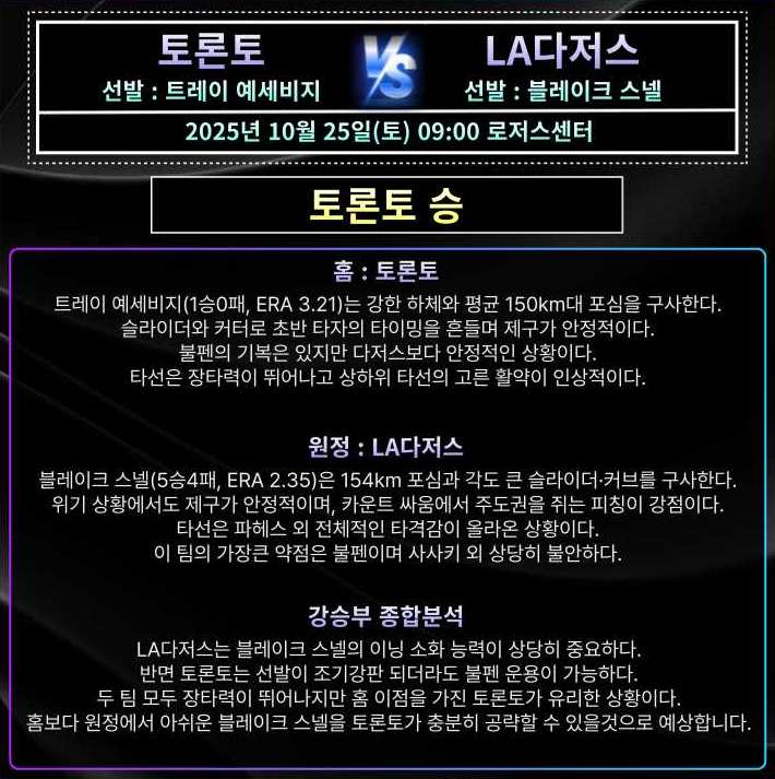 | 2025-10-28 19:00 MLB LA 다저스 vs 토론토 블루제이스 (0) | 2025.10.27 |