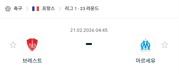 2026년 02월 21일에 열리는 리그 1의 스타드 브레스트와 올랭피크 마르세유의 경기 분석입니다. 프랑스 챔피언십 23라운드의 시작을 알리는 이번 맞대결에서 최근 리그 3경기 연속 승리가 없는 올랭피크 마르세유는 부진을 끊어내기 위해 사활을 걸고 있습니다. 반면 홈팀 스타드 브레스트는 최근 무패 행진을 이어가며 상승세를 타고 있으나 전통적으로 올랭피크 마르세유에게 약한 모습을 보여왔습니다. 지난 3번의 맞대결에서 올랭피크 마르세유가 합계 점수 12-2로 압도적인 우위를 점하고 있는 가운데 이번 경기에서도 천적 관계가 이어질지 아니면 스타드 브레스트가 홈 팬들 앞에서 반전의 드라마를 쓸 수 있을지 주목되는 일전입니다.