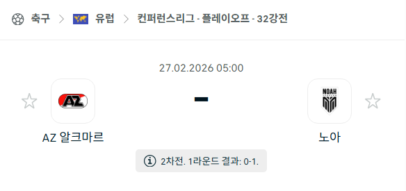 2026년 02월 27일에 열리는 컨퍼런스리그 플레이오프 2차전 AZ 알크마르와 FC 노아의 경기 분석입니다. 지난 02월 20일 아르메니아 예레반에서 열린 1차전에서는 모두의 예상을 깨고 FC 노아가 1-0 승리를 거두며 유리한 고지를 점했습니다. 당시 AZ 알크마르는 70%의 압도적인 점유율을 기록하며 경기를 주도했으나, FC 노아의 견고한 수비벽을 뚫지 못하고 역습 한 방에 무너졌습니다. 이제 장소를 네덜란드 알크마르의 AFAS 스타디움으로 옮겨 치러지는 2차전에서 AZ 알크마르는 반드시 승리해야만 하는 상황입니다. 전력상 우위에 있는 AZ 알크마르의 파상공세와 이를 막아내려는 FC 노아의 끈질긴 수비 대결이 이번 경기의 핵심 관전 포인트입니다.