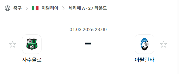 2026년 03월 01일에 열리는 세리에 A의 사수올로와 아탈란타의 경기 분석입니다. 이번 경기는 사수올로의 홈구장인 마페이 스타디움에서 열리며, 최근 모든 대회를 통틀어 5경기 중 4승을 거두며 절정의 폼을 보여주고 있는 두 팀의 맞대결로 큰 관심을 모으고 있습니다. 현재 아탈란타는 리그 상위권 도약을 위해 승점이 절실한 상황이며, 사수올로 역시 중위권 안착을 넘어 더 높은 곳을 바라보고 있습니다. 양 팀의 승점 차는 존재하지만 최근 기세가 워낙 훌륭하여 어느 한 쪽의 일방적인 승부를 예측하기 힘든 팽팽한 접전이 예상되는 매치업입니다.
