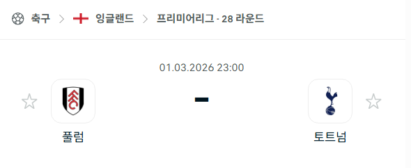 2026년 03월 01일에 열리는 잉글랜드 프리미어리그의 풀럼과 토트넘 홋스퍼의 경기 분석입니다. 이번 경기는 풀럼의 홈구장인 크레이븐 코티지에서 열리는 런던 더비로, 리그 10위권에 진입하며 상승세를 타고 있는 풀럼과 심각한 부진에 빠진 토트넘 홋스퍼의 맞대결입니다. 토트넘 홋스퍼는 2026년 들어 리그 승리가 없는 9경기 무승이라는 최악의 늪에 빠져 있으며, 새롭게 부임한 이고르 투도르 감독 체제 아래 반등을 노리고 있습니다. 반면 풀럼은 이번 시즌 토트넘 홋스퍼를 상대로 리그 더블을 달성하기 위해 홈 이점과 상대의 불안한 전력을 적극 공략할 것으로 보입니다.