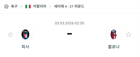 2026년 03월 03일에 열리는 세리에 A의 피사와 볼로냐의 경기 분석입니다. 이번 경기는 피사의 홈 구장인 아레나 가리발디에서 펼쳐지는 리그 27라운드 맞대결입니다. 홈팀 피사는 강등권인 19위에 머물며 잔류권과의 격차가 벌어지는 힘겨운 사투를 벌이고 있으며, 매 경기 승점이 절실한 상황입니다. 반면 원정팀 볼로냐는 최근 공식 경기 4연승을 달리며 안정적인 흐름을 되찾았고, 유럽 대항전에서도 성과를 내며 기세가 올라 있습니다. 두 팀의 통산 맞대결은 데이터상 볼로냐가 우위를 점하고 있으며, 특히 이번 시즌 첫 맞대결에서는 볼로냐가 4-0 대승을 거둔 바 있습니다. 피사가 안방에서 반전의 계기를 마련할 수 있을지, 아니면 볼로냐가 연승 행진을 이어갈지가 이번 경기의 핵심 관전 포인트입니다.