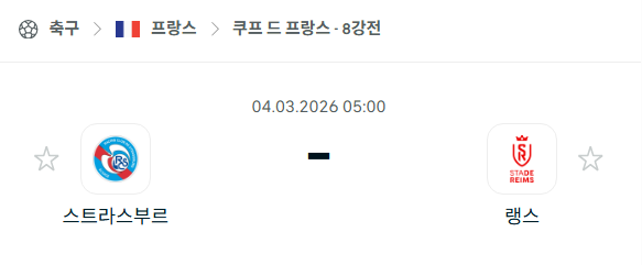 2026년 03월 04일에 열리는 쿠프 드 프랑스의 스트라스부르와 랭스의 경기 분석입니다. 이번 경기는 쿠프 드 프랑스 8강전으로 스트라스부르의 홈 구장인 스타드 드 라 메노에서 단판 승부로 치러집니다. 스트라스부르는 16강에서 모나코를 3-1로 완파하며 8강에 올랐고, 랭스는 르망을 3-0으로 제압하며 준결승행 티켓을 노리고 있습니다. 스트라스부르는 2001년 우승 이후 첫 준결승 진출을 꿈꾸고 있으며, 리그 2 소속인 랭스는 이변을 일으키며 상위 리그 팀을 상대로 도전장을 내밀었습니다.