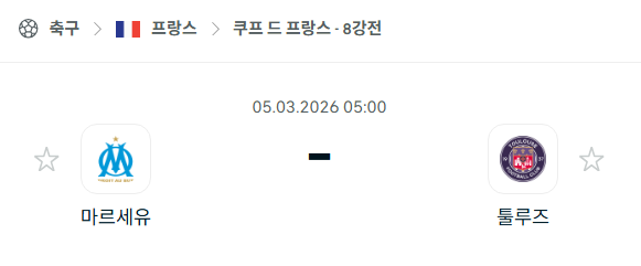2026년 03월 05일에 열리는 쿠프 드 프랑스(프랑스 컵)의 올랭피크 마르세유와 툴루즈의 경기 분석입니다. 이번 경기는 컵대회 8강전으로 마르세유의 홈구장인 오랑주 벨로드롬에서 펼쳐집니다. 홈팀 마르세유는 이번 시즌 컵대회에서 압도적인 수비력을 바탕으로 무실점 행진을 이어가며 준결승 진출을 노리고 있습니다. 반면 원정팀 툴루즈는 최근 리그에서의 극심한 부진을 컵대회 승리로 만회하려 하지만, 지난 15년 동안 마르세유를 상대로 정규 시간 내에 승리한 적이 없을 정도로 지독한 천적 관계에 놓여 있습니다. 북메이커들은 홈 이점과 전력의 우위를 가진 마르세유의 승리 가능성을 높게 평가하고 있습니다.