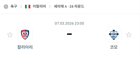 2026년 03월 07일에 열리는 이탈리아 세리에 A의 칼리아리 칼초와 코모 1907의 경기 분석입니다. 이번 28라운드 맞대결은 우니폴 도무스에서 펼쳐지며, 챔피언스리그 진출권을 노리는 코모와 강등권 사투를 벌이고 있는 칼리아리의 상반된 목표가 충돌하는 지점입니다. 코모는 이번 시즌 인상적인 성적을 거두며 리그 상위권을 유지하고 있으며, 칼리아리는 잔류를 위해 안방에서 반드시 승점이 필요한 절박한 상황입니다. 최근 맞대결 전적은 팽팽하지만, 이번 시즌 보여준 양 팀의 경기력 차이가 결과에 큰 영향을 미칠 것으로 보입니다.