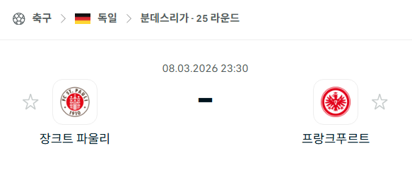 2026년 03월 08일에 열리는 분데스리가의 장크트 파울리와 아인트라흐트 프랑크푸르트의 경기 분석입니다. 이번 경기는 최근 강등권 탈출에 성공하며 기세를 올리고 있는 홈팀 장크트 파울리와 유럽 대항전 진출권을 목표로 승점 확보가 절실한 아인트라흐트 프랑크푸르트의 맞대결입니다. 장크트 파울리는 홈 팬들의 열광적인 응원을 등에 업고 생존을 위한 투쟁을 이어가려 하며, 프랑크푸르트는 원정 경기에서의 부진을 털어내고 상위권 추격을 노리고 있습니다. 생존이라는 절박한 동기와 유럽 무대 복귀라는 야망이 충돌하는 이번 경기는 두 팀의 상반된 전략과 동기부여가 승부의 핵심이 될 것입니다.