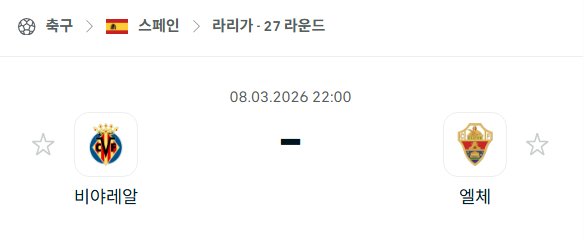 2026년 03월 08일에 열리는 라리가의 비야레알과 엘체의 경기 분석입니다. 이번 경기는 리그 상위권에서 챔피언스리그 진출권을 노리는 비야레알과 강등권 탈출을 위해 사투를 벌이고 있는 엘체의 맞대결입니다. 홈팀 비야레알은 최근 바르셀로나에게 대패하며 주춤했지만 홈에서 압도적인 성적을 거두고 있으며, 원정팀 엘체는 이번 시즌 원정 승리가 단 한 번도 없을 정도로 원정길에서 고전하고 있습니다. 확연한 전력 차이와 상반된 팀 분위기 속에서 펼쳐지는 이번 경기는 두 팀 모두에게 향후 시즌 목표 달성을 위한 중요한 분수령이 될 전망입니다.
