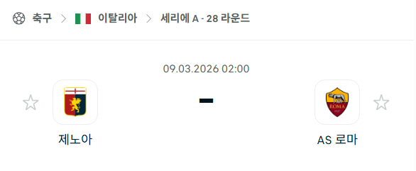 2026년 03월 09일에 열리는 세리에 A의 제노아 CFC와 AS 로마의 경기 분석입니다. 이번 경기는 루이지 페라리스 스타디움에서 열리는 28라운드 맞대결로, 다니엘레 데 로시 감독 부임 이후 끈질긴 저력을 보여주고 있는 제노아와 챔피언스리그 진출권을 지키기 위해 사투를 벌이고 있는 로마의 격돌입니다. 제노아는 안방에서 강팀들을 상대로 유독 강한 면모를 보이며 승점을 쌓아왔고, 로마는 최근 유벤투스와의 혈투 끝에 아쉬운 무승부를 기록하며 분위기 반전이 필요한 시점입니다. 순위표상의 격차는 존재하지만 제노아의 홈 강세와 로마의 원정 기복이 맞물려 매우 팽팽한 승부가 예상되는 매치업입니다.