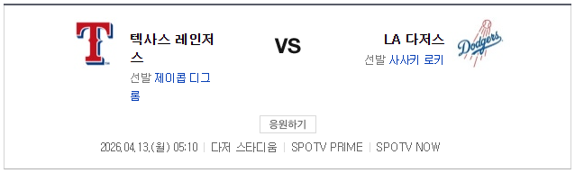 2026년 04월 13일에 열리는 메이저리그의 LA 다저스와 텍사스 레인저스의 경기 분석입니다. 이번 시리즈는 홈팀 LA 다저스의 의도대로 흘러가고 있습니다. 첫 경기에서 8-7로 승리하며 기분 좋게 시작한 다저스는 지난 04월 12일 토요일 경기에서도 6-3으로 승리를 거두며 시리즈 우위를 점했습니다. 특히 직전 경기에서는 1회부터 오타니 쇼헤이의 홈런과 테오스카 에르난데스의 3타점 적시타가 터지며 일찌감치 승기를 잡았습니다. 텍사스 레인저스는 매 경기 경쟁력 있는 모습을 보여주고 있으나 결정적인 순간마다 다저스의 화력을 넘어서지 못하고 있습니다. 이제 시리즈의 마지막 대결에서 다저스가 스윕을 완성할지, 아니면 텍사스가 반격에 성공할지가 결정될 것입니다.