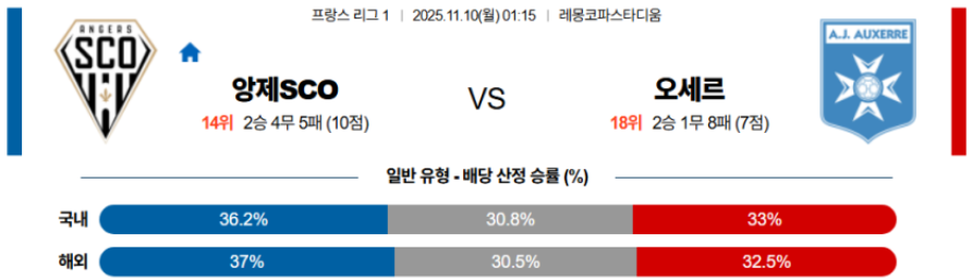 ⚠️ 후반 체력 격차가 벌어지면 오세르의 수비 조직은 붕괴될 가능성이 높고, 앙제가 템포를 조절하며 승부를 마무리할 것이다.