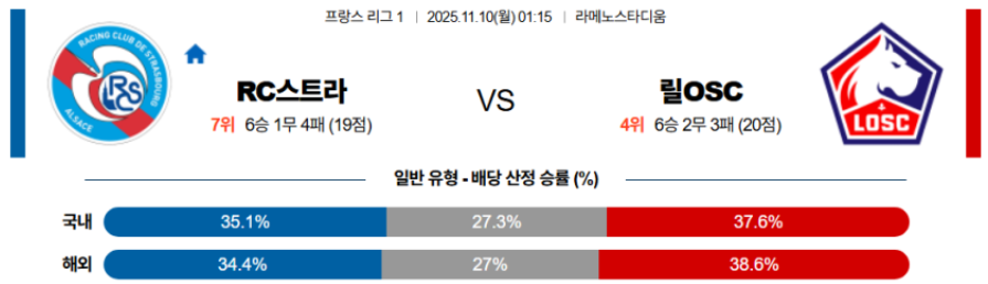 릴의 수비 밸런스가 아직 완성되지 않은 상황에서, 스트라스부르는 홈의 분위기와 전술적 완성도를 앞세워 경기를 주도할 것이다.