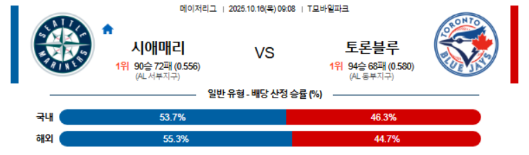 | 2025년 10월 17일 MLB 시애틀 매리너스 vs 토론토 블루제이스 (0) | 2025.10.16 |