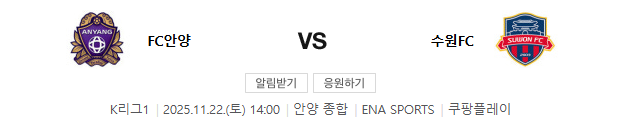 이번 경기는 이미 잔류가 확정된 안양과 생존을 위해 반드시 승리가 필요한 수원FC의 동기부여 차이가 흐름을 결정할 것으로 보입니다. 안양은 안정적 블록 유지와 제한적 역습 위주로 운영할 가능성이 높고 수원FC는 초반부터 공격 숫자를 올리고 세컨볼과 측면 연계를 통해 박스 안 점유를 늘리는 전개가 예상됩니다. 시간이 지날수록 수원FC가 압박과 점유 우위에서 유리해지고 경기를 주도할 가능성이 큽니다. 경기 전체 흐름과 승부 기대값은 동기부여가 강한 수원FC 쪽으로 기울어질 가능성이 높습니다.