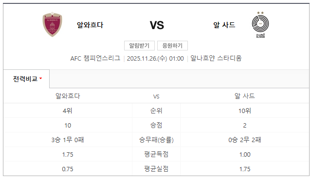 알 와흐다(UAE) (서부 리그 4위) vs 알 사드(QAT) (서부 리그 10위)