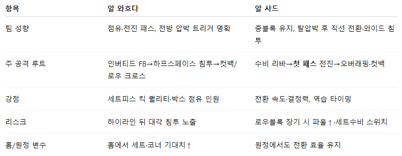 - 프레임: 와흐다의 점유·지역 점거+세트피스 누적 vs 사드의 중블록→고속 전환(컷백·대각 침투).