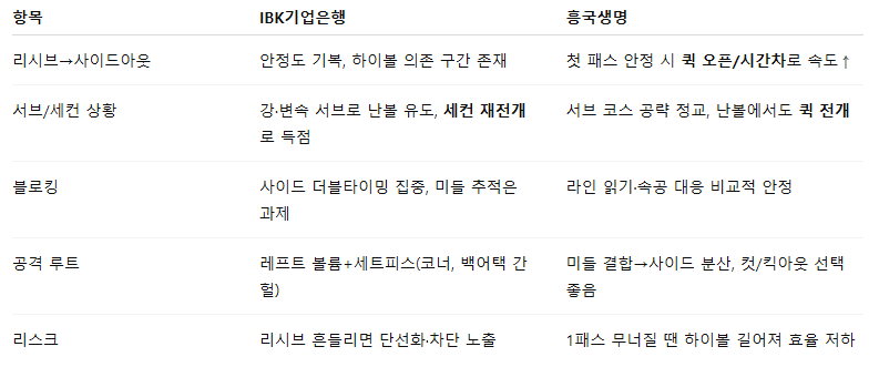 - 프레임: IBK는 서브-블로킹으로 리시브를 흔들어 랠리를 길게, 흥국생명은 **사이드아웃 속도(첫 패스→퀵 오픈/시간차)**로 템포 우위를 노리는 구도.