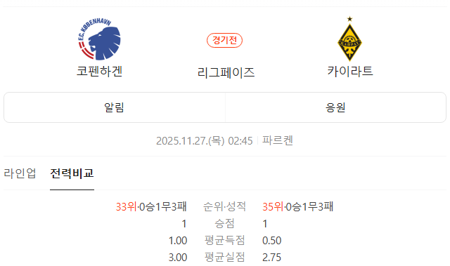 코펜하겐 (33위 · 0-1-3 · 1점) vs 카이라트 (35위 · 0-1-3 · 1점)
