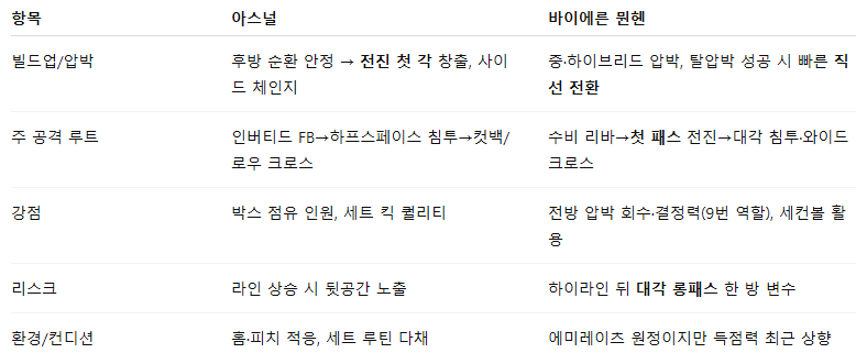- 아스널은 외곽 회수→재크로스 루틴이 좋고, 바이에른은 킥 정확도·런인 타이밍으로 차이를 만든다.