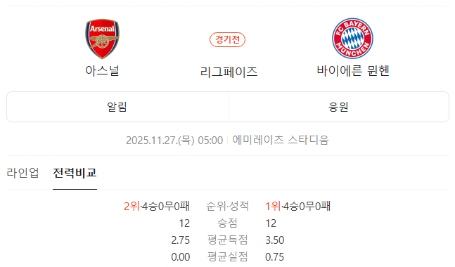 아스널 (리그페이즈 2위 · 4-0-0 · 12점) vs 바이에른 뮌헨 (1위 · 4-0-0 · 12점)