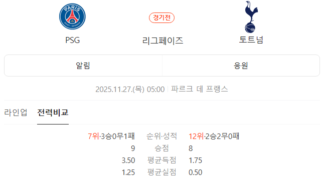 파리 생제르맹 (7위 · 3-0-1 · 9점) vs 토트넘 홋스퍼 (12위 · 2-2-0 · 8점)