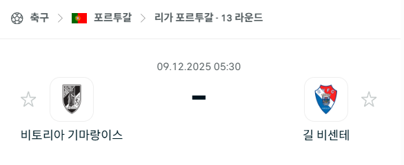 2025년 12월09일에 열리는 프리메이라리가의 비토리아SC 기마랑이스 길 비센테 경기 분석입니다. 이번 경기는 중상위권에서 유럽대항전 경쟁을 노리는 두 팀이 맞붙는 중요한 일정입니다. 비토리아SC 기마랑이스는 시즌 초중반 기복이 있었지만 최근 들어 4승1패라는 뛰어난 흐름을 만들며 공격력이 크게 살아난 모습입니다. 반면 길 비센테는 올 시즌 리그 최고의 원정 안정감을 보여주며 탄탄한 수비 조직을 기반으로 꾸준히 승점을 쌓고 있습니다. 두 팀의 스타일이 확연히 다르다는 점에서 경기 양상은 치열한 밸런스 싸움이 예상되며, 과거 맞대결의 득점 패턴 또한 이번 경기의 향방에 중요한 단서가 될 전망입니다.