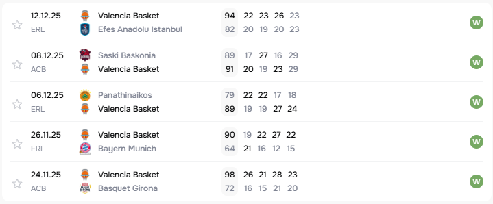 발렌시아는 유로리그에서 4연승을 달리며 확실한 상승세를 타고 있습니다. 현재 리그 2위를 유지 중이며, 경기당 85점 이하 득점이 거의 없는 강력한 공격력이 순위의 원동력입니다.