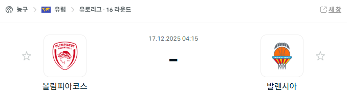 | 2025년 12월 17일 유로리그 페네르바체 vs 파나시나이코스 (0) | 2025.12.16 |