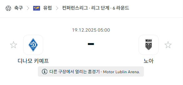 2025년 12월 19일에 열리는 UEFA 컨퍼런스리그의 디나모 키예프와 FC 노아 경기 분석입니다. 이번 경기는 리그 페이즈 최종 라운드로, 이미 탈락이 확정된 디나모 키예프와 플레이오프 진출 가능성이 남아 있는 FC 노아가 맞붙는 일정입니다. 양 팀 모두 동기 부여의 방향은 다르지만, 공격적인 운영이 예상되는 매치업입니다.