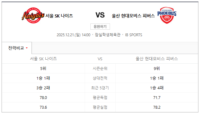 - 울산 현대모비스 피버스는 서울 SK 나이츠를 상대로 한 최근 원정 8경기 중 7경기에서 71.5점 초과 득점