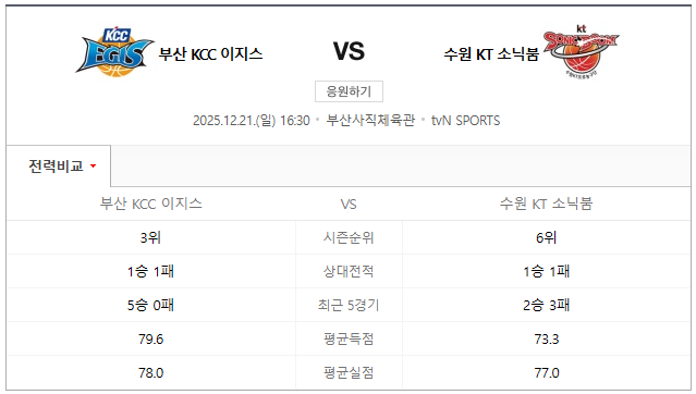 (부산 KCC 이지스 홈 vs 수원 KT 소닉붐 원정)