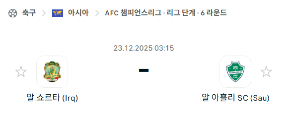 | 알가라파 vs 알와흐다 분석 | AFC 챔피언스리그 (12/23) (0) | 2025.12.22 |