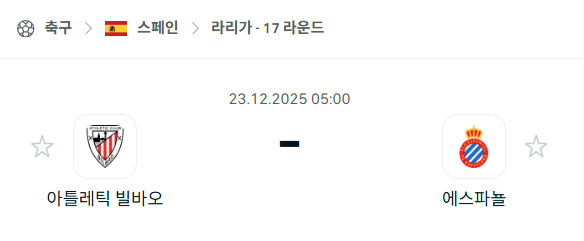 2025년 12월 23일에 열리는 스페인 라리가의 아틀레틱 빌바오 에스파뇰 바르셀로나 경기 분석입니다. 이번 경기는 라리가 17라운드의 마지막 경기로, 유럽 대항전 진출을 노리는 두 팀이 맞붙는 중요한 일정입니다. 에스파뇰은 최근 상승세를 타고 있으며, 아틀레틱 빌바오는 홈 이점을 앞세워 반등을 노리는 상황이라 치열한 접전이 예상됩니다.