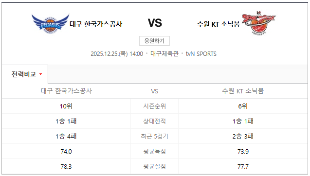 통계: 대구 한국가스공사 vs 수원 KT