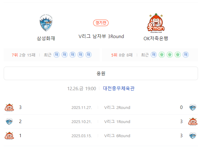 삼성화재 3세트 패: 최근 12경기 중 11경기, 최근 홈 5경기